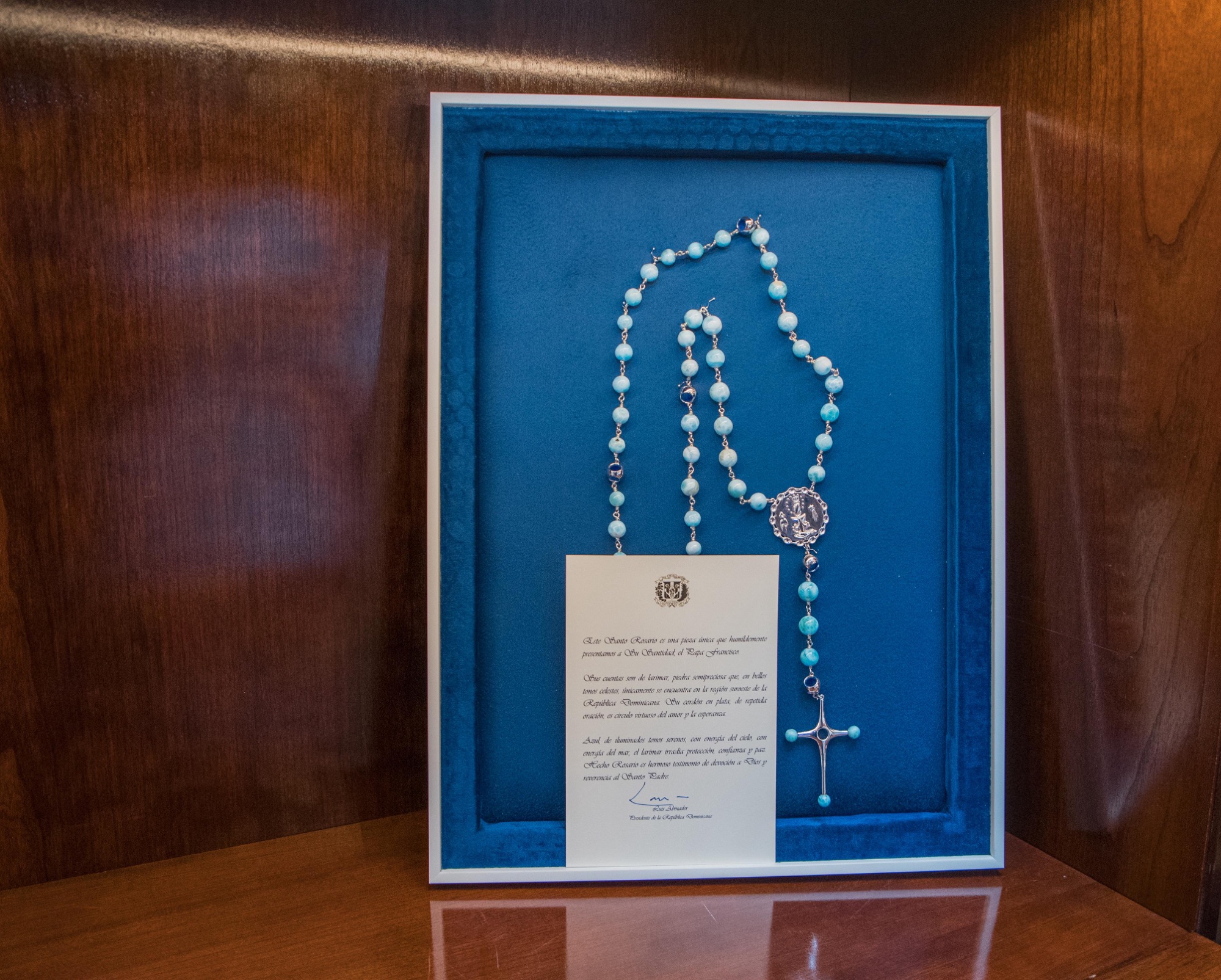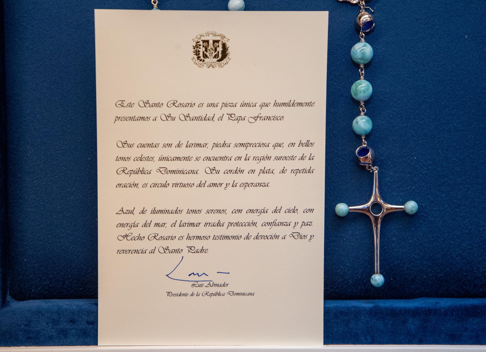 El presidente Abinader le obsequió al sumo pontífice un Santo Rosario con un emotivo mensaje que expresa: «Este Santo Rosario es una pieza única que humildemente presentamos a Su Santidad el papá Francisco. Sus cuentas son de larimar, piedra semipreciosa que, en bellos tonos celestes, únicamente se encuentra en la región suroeste de la República Dominicana. Su cordón eb plata, de repetida oración, es un círculo virtuoso del amor y la esperanza».