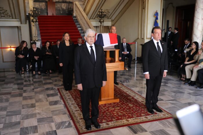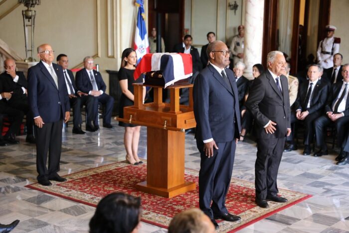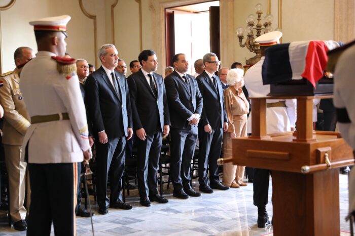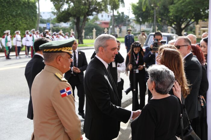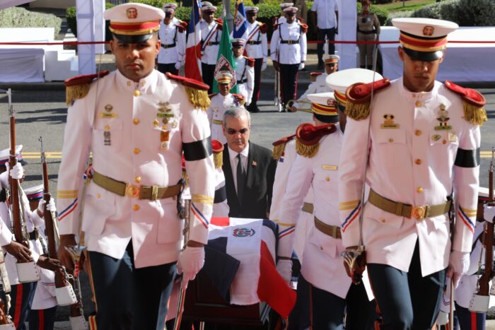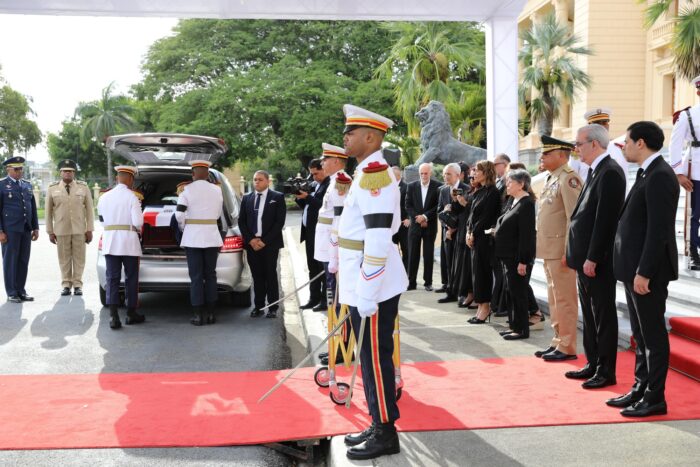 El Funeral de Estado inició a las 3:00 de la tarde en el Palacio Nacional, con el recibimiento de los restos del héroe y la llegada del mandatario, acompañado de la primera dama, Raquel Arbaje; la vicepresidenta, Raquel Peña; y diversos ministros y autoridades civiles, militares y eclesiásticas.