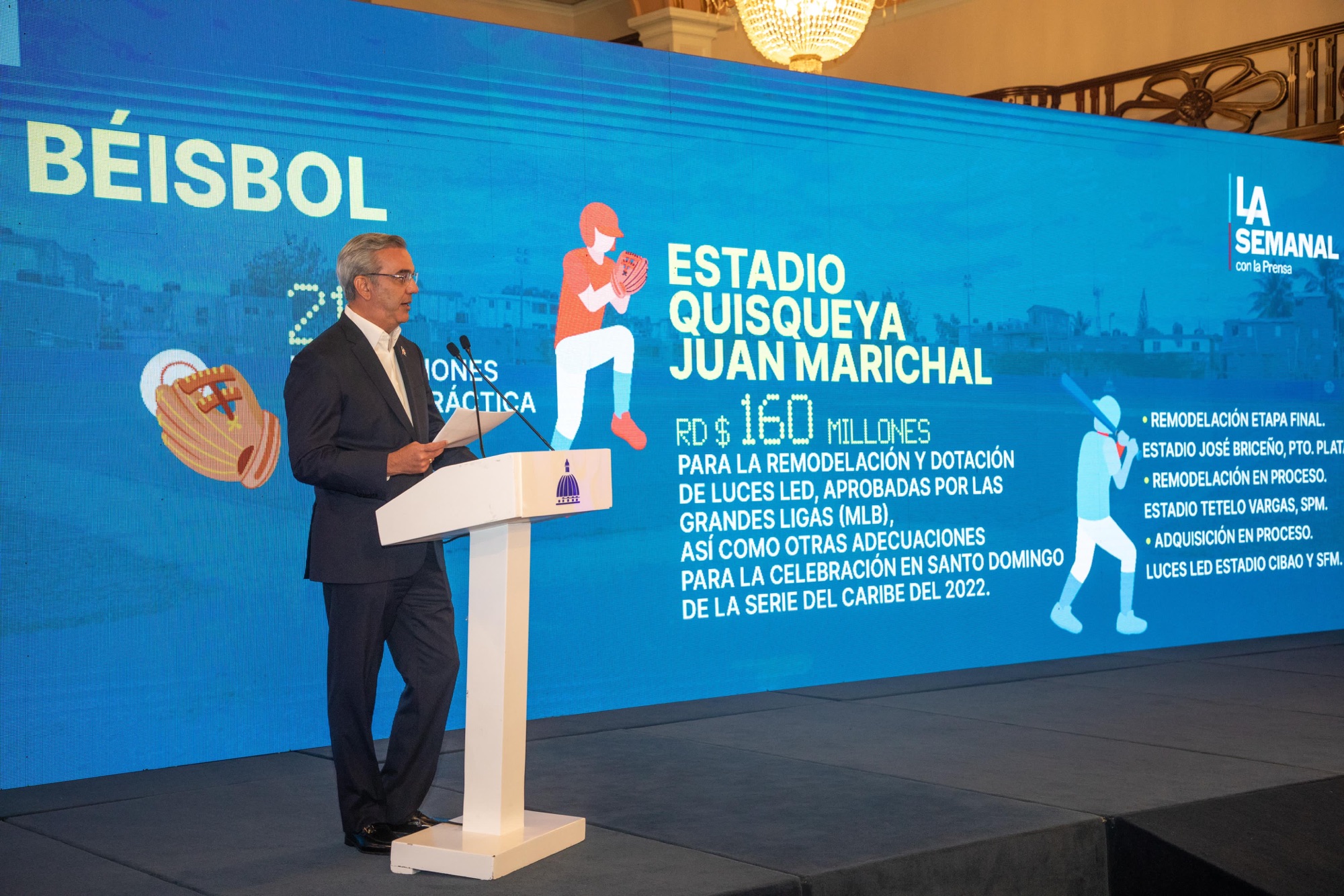 Con este tema, informó que 21 instalaciones para la práctica de beisbol y softbol han sido habilitadas. Asimismo, se destinaron RD$160 millones para la remodelación y dotación de luces led, así como otras adecuaciones para la celebración en Santo Domingo de la Serie del Caribe de 2022 en el Estadio Quisqueya Juan Marichal.