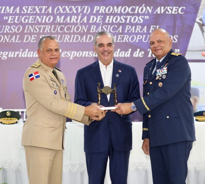El presidente Luis Abinader acompañado del ministro de Defensa teniente general Carlos Fernández Onofre, encabezó este jueves el acto de graduación múltiple del Cuerpo Especializado en Seguridad Aeroportuaria y de la Aviación Civil (CESAC), correspondiente a la Trigésima Sexta Promoción del Curso de Instrucción Básica para el Personal de Seguridad de Aeropuertos “Eugenio María de Hostos”, en el marco de la conmemoración del 29.º aniversario de esa institución.