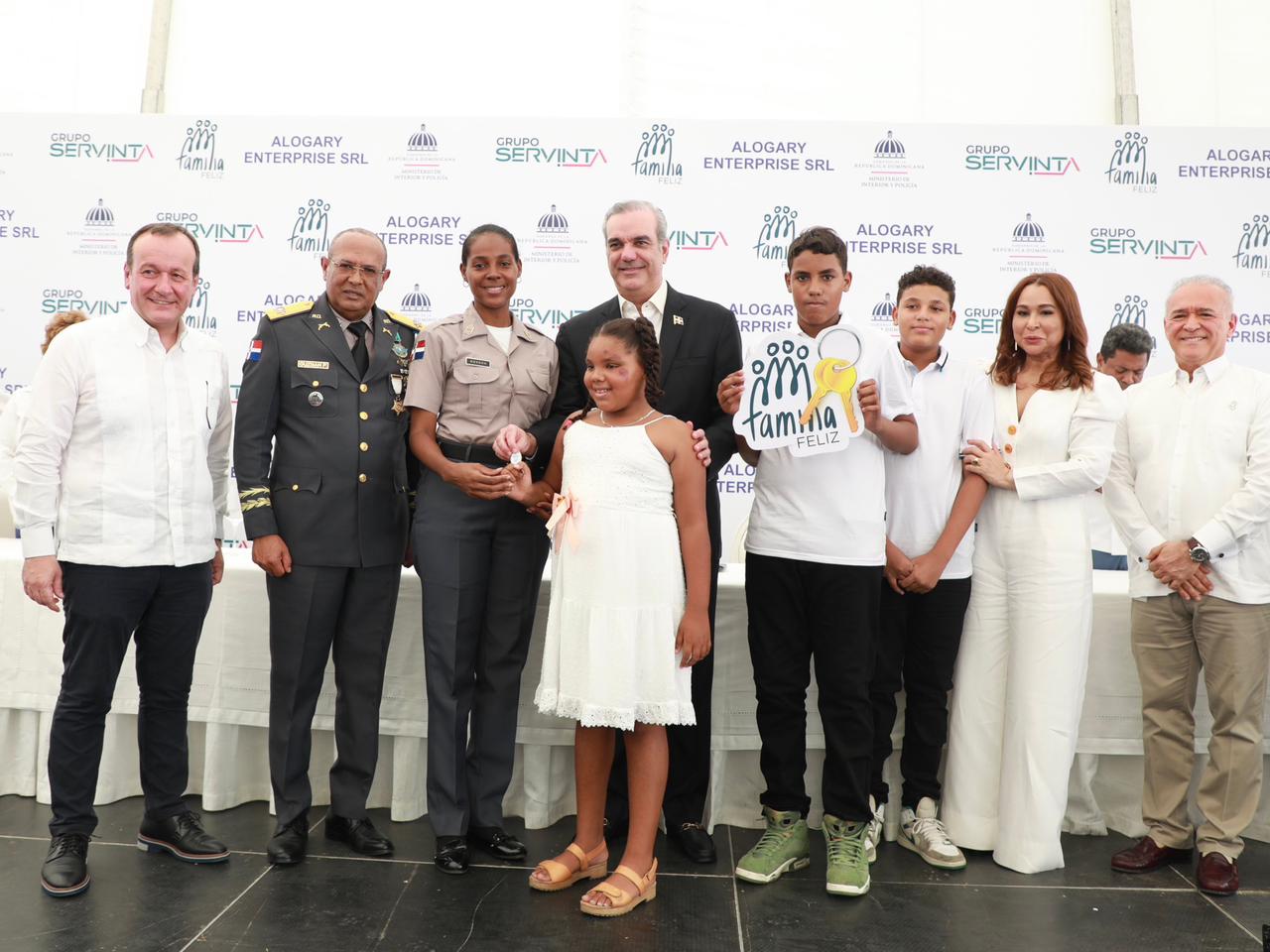 El presidente Luis Abinader entregó este lunes 250 apartamentos del Plan Nacional de Vivienda Familia Feliz a miembros de la Policía Nacional, entre ellas madres solteras, continuando con la transformación a la institución de la ley y orden y llevando dignidad con un techo propio a sus integrantes.