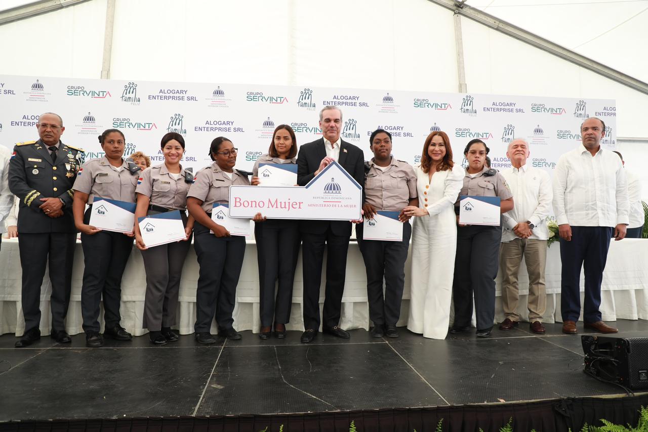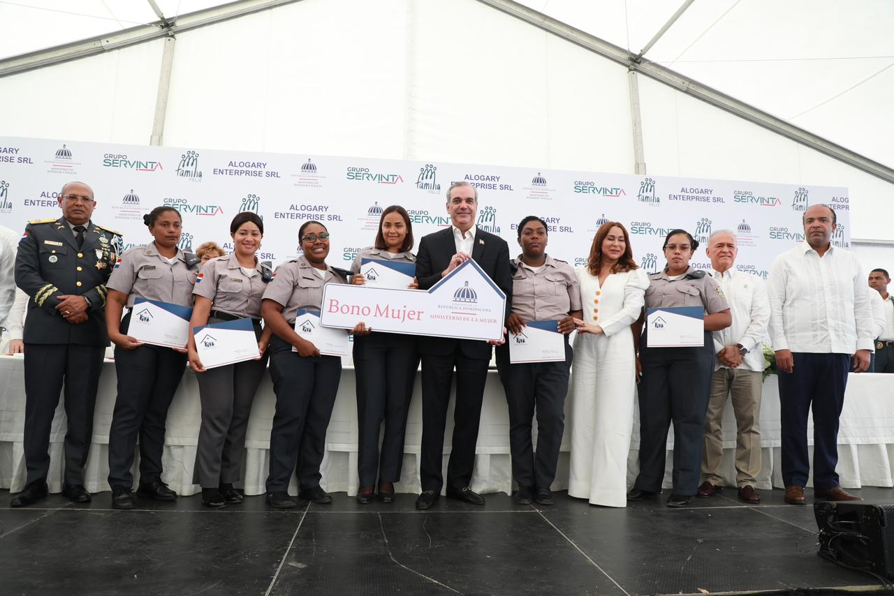 En el acto 11 mujeres fueron beneficiarias con el bono mujer que es una contribución económica que otorga el Ministerio de la Mujer, para que madres solteras, mujeres víctimas de violencia, mujeres con discapacidad o bajos salarios, mujeres que cuidan personas adultas mayores, familias que acogen a niñas y niños en orfandad por feminicidio, y mujeres dominicanas en el exterior, puedan acceder a una vivienda digna y propia.