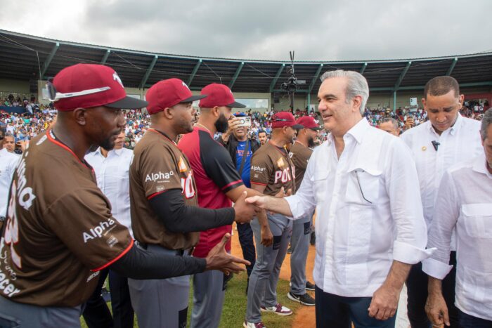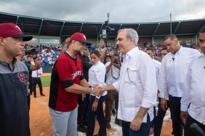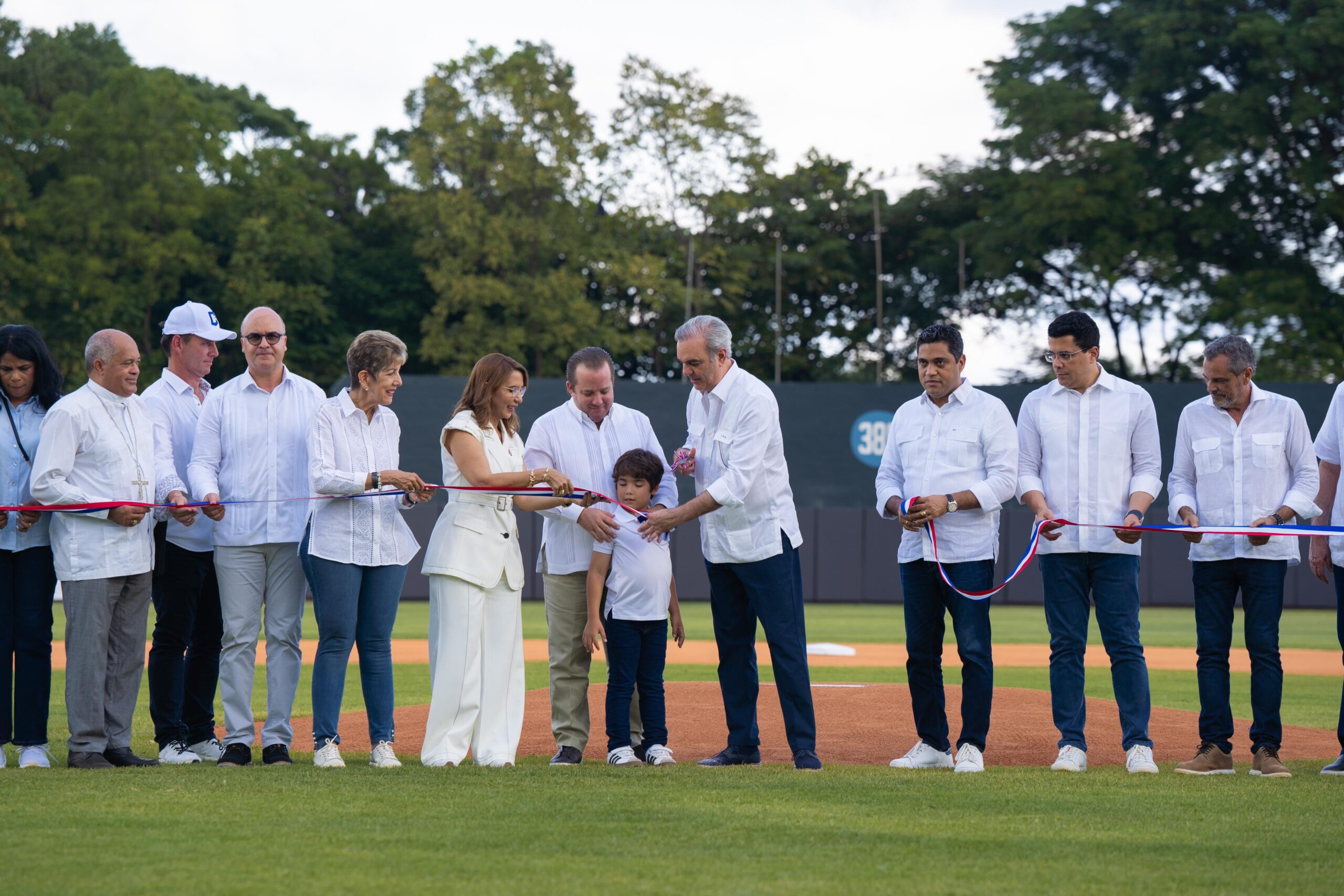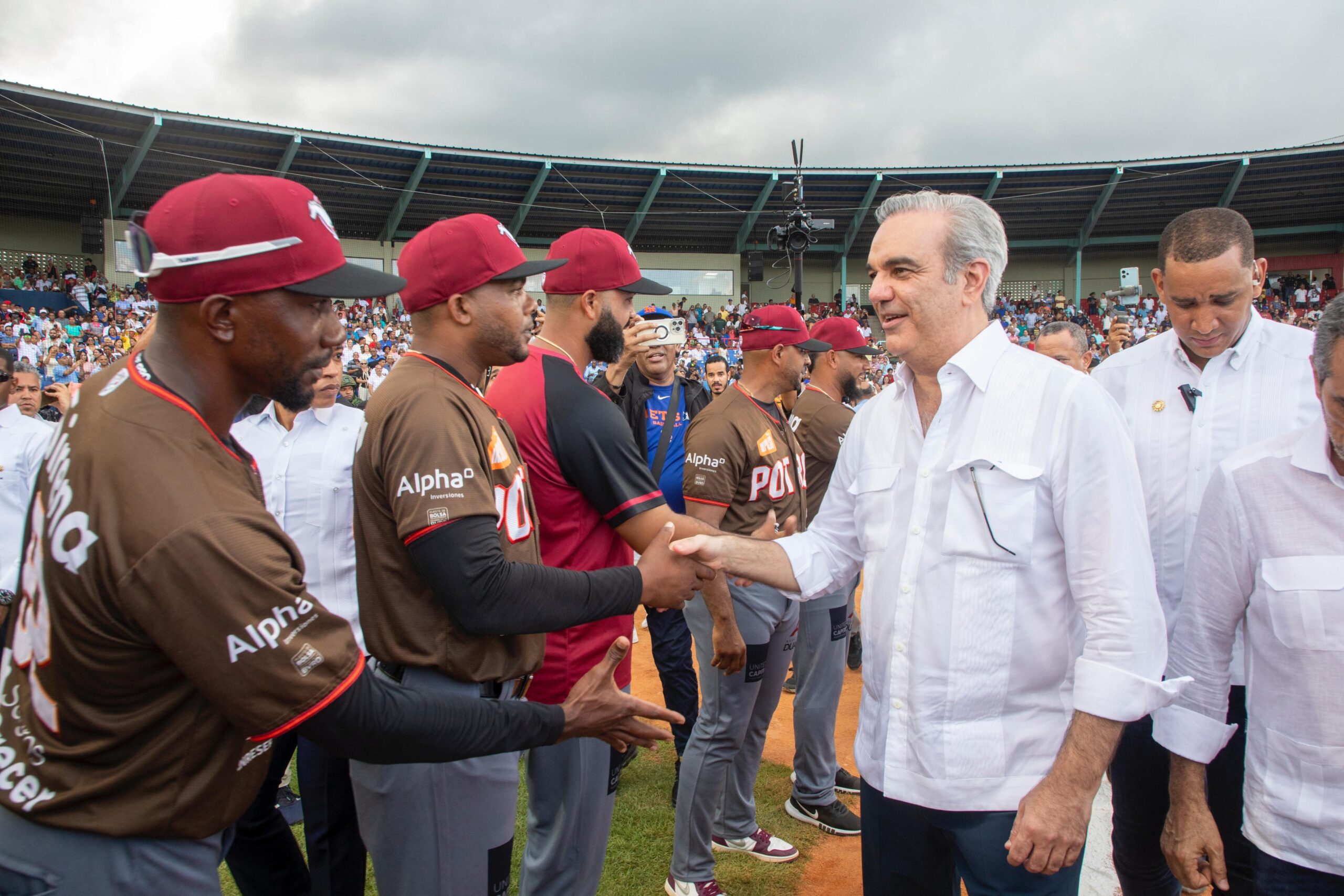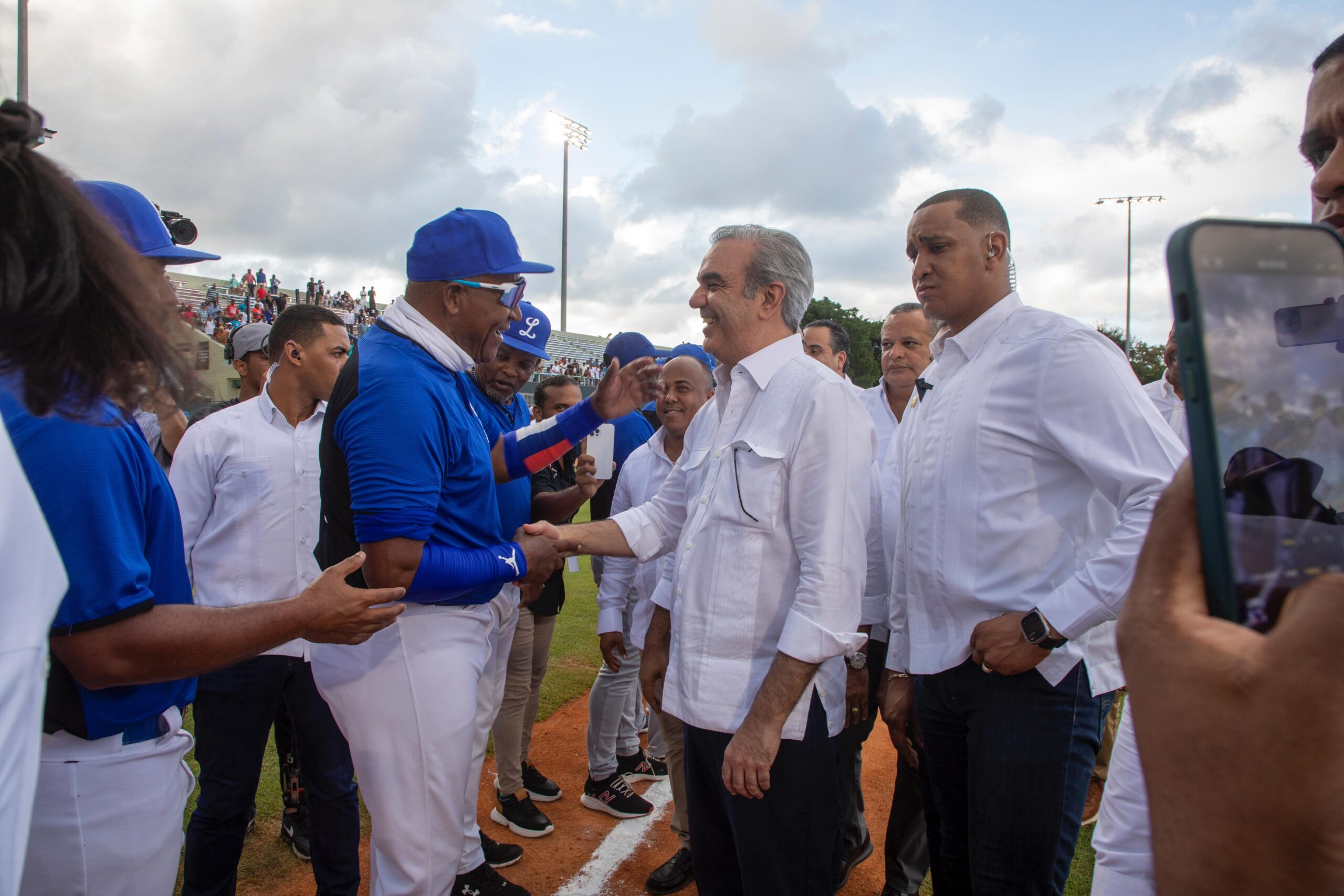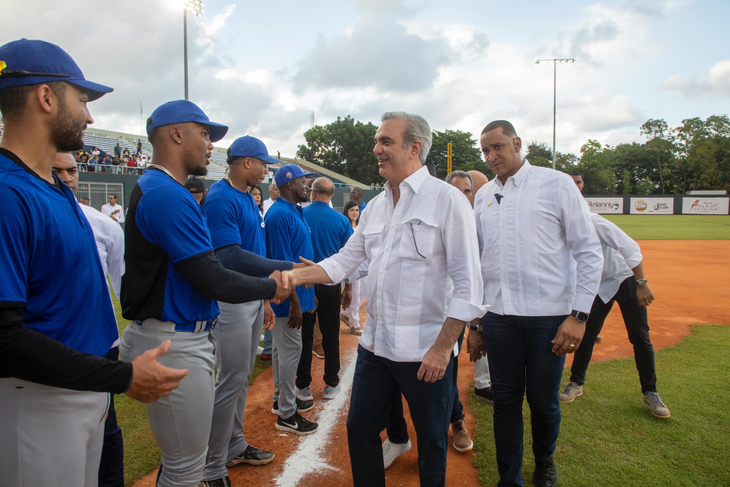 El mandatario también realizó el lanzamiento de la primera bola del partido de pretemporada entre los Tigres del Licey y Gigantes del Cibao, la cual fue recibida por el capitán de los Tigres del Licey, Emilio Bonifacio.