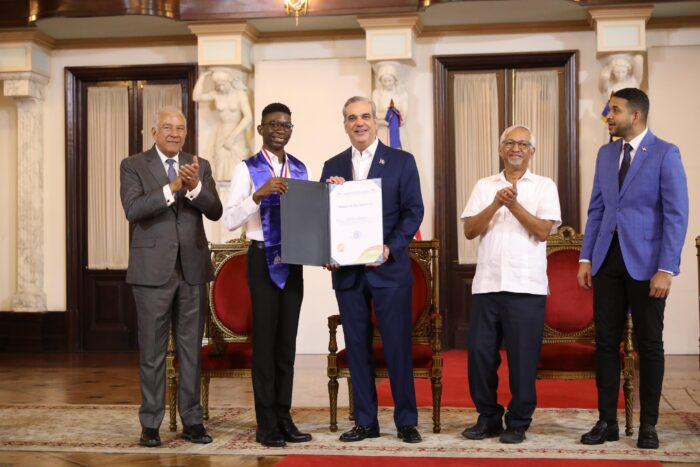 El presidente Luis Abinader junto al ministro de Educación, Ángel Hernández entregó este miércoles el «Galardón Diploma de Máxima Excelencia 2023-2024” a 150 estudiantes de las 18 direcciones regionales de educación del país, que obtuvieron un promedio académico superior a 90 puntos durante su trayectoria de seis años en la secundaria.