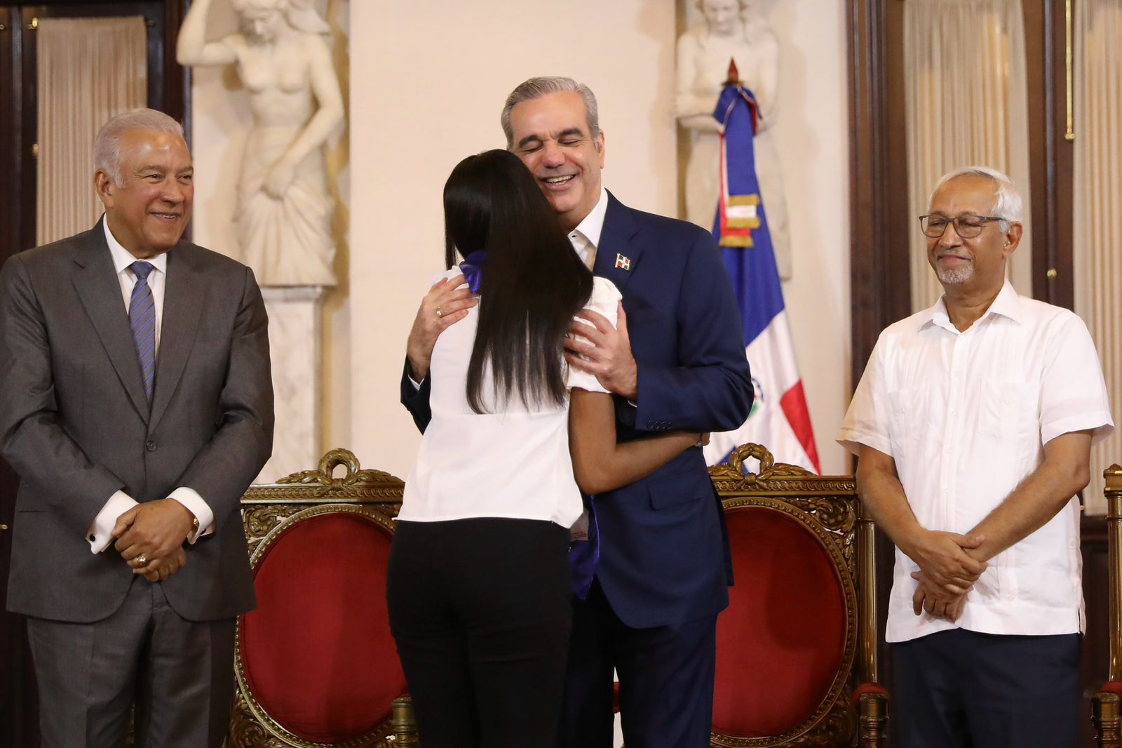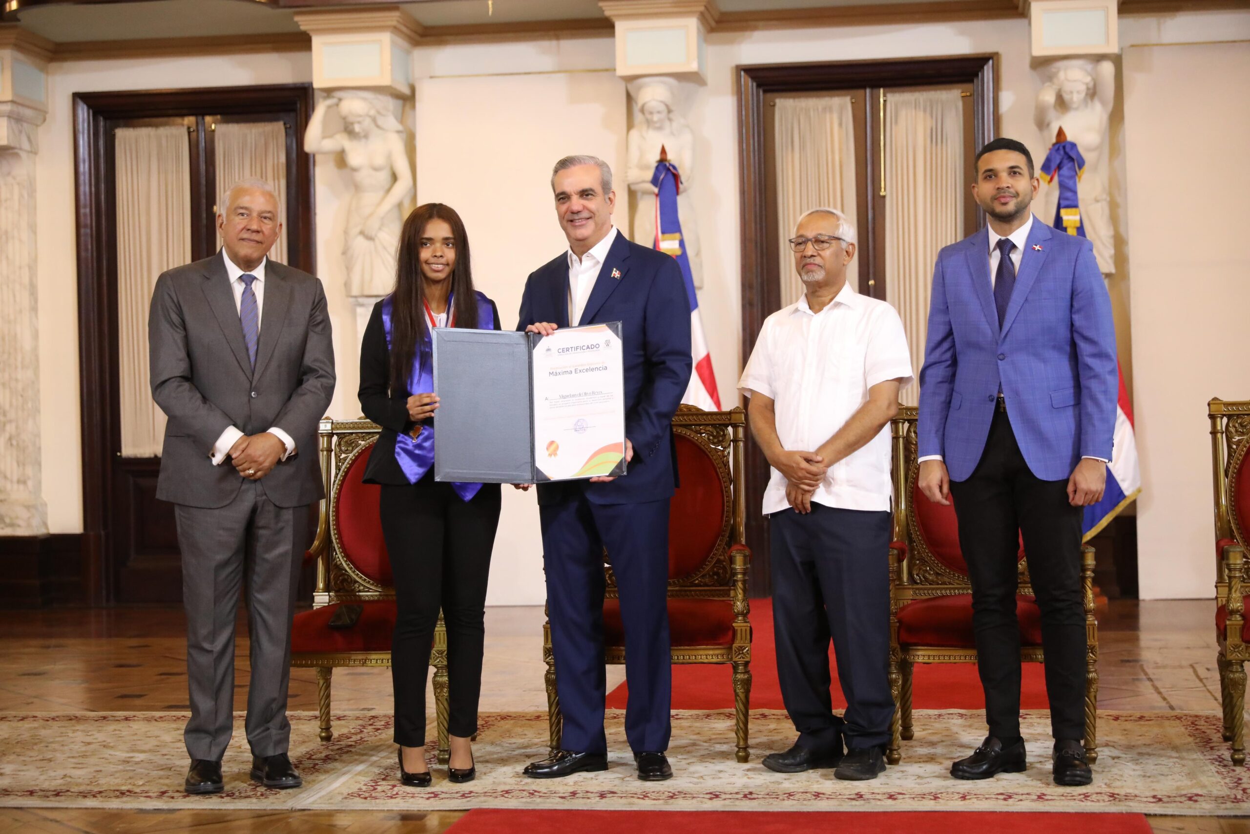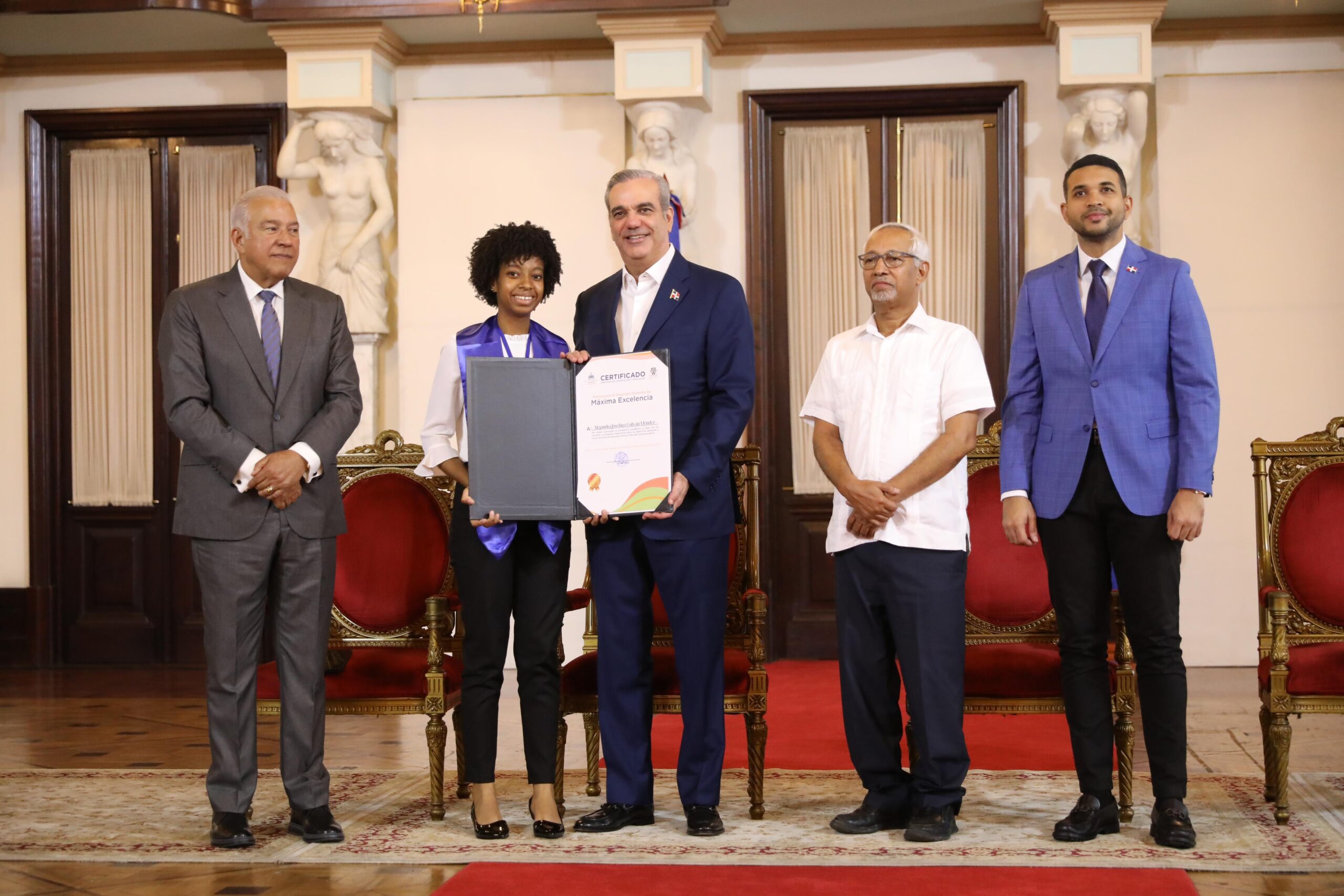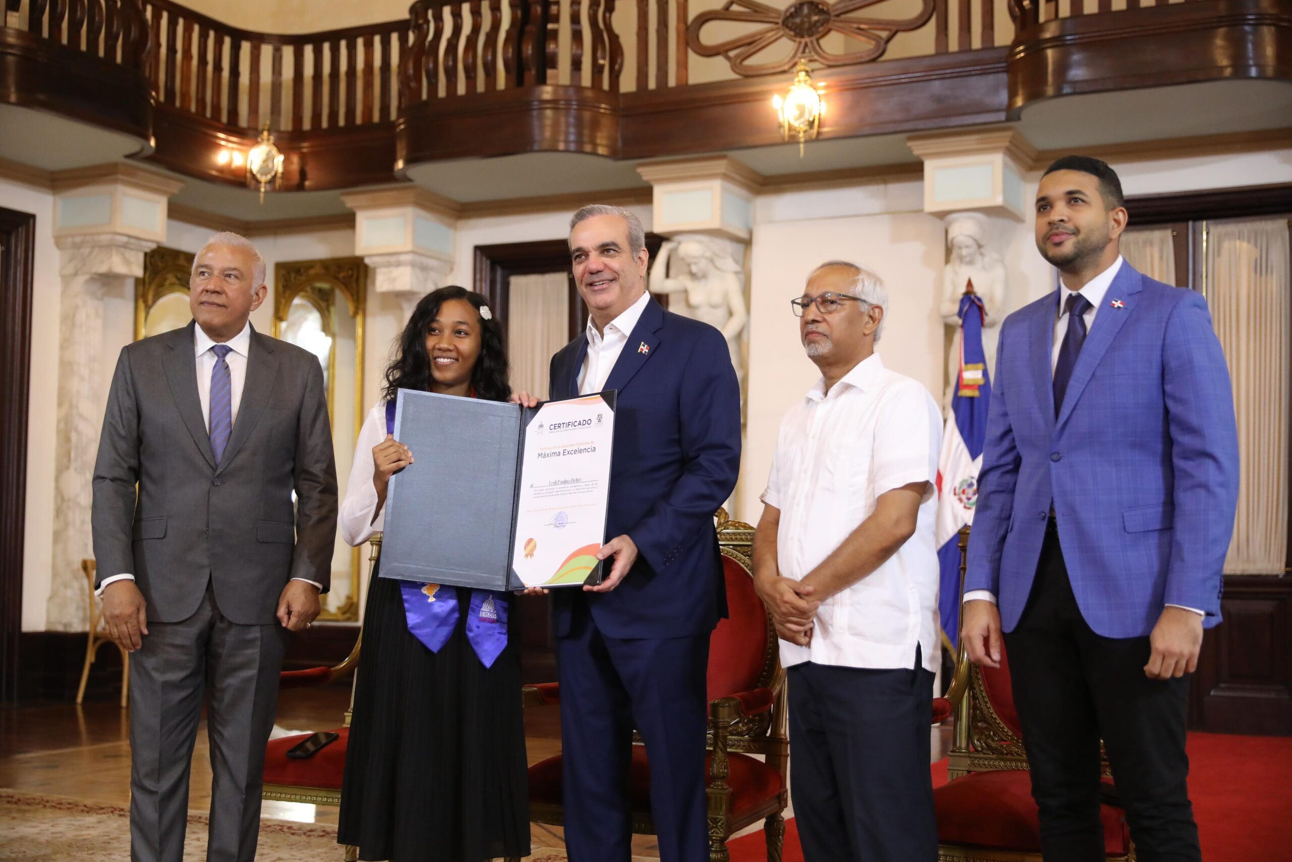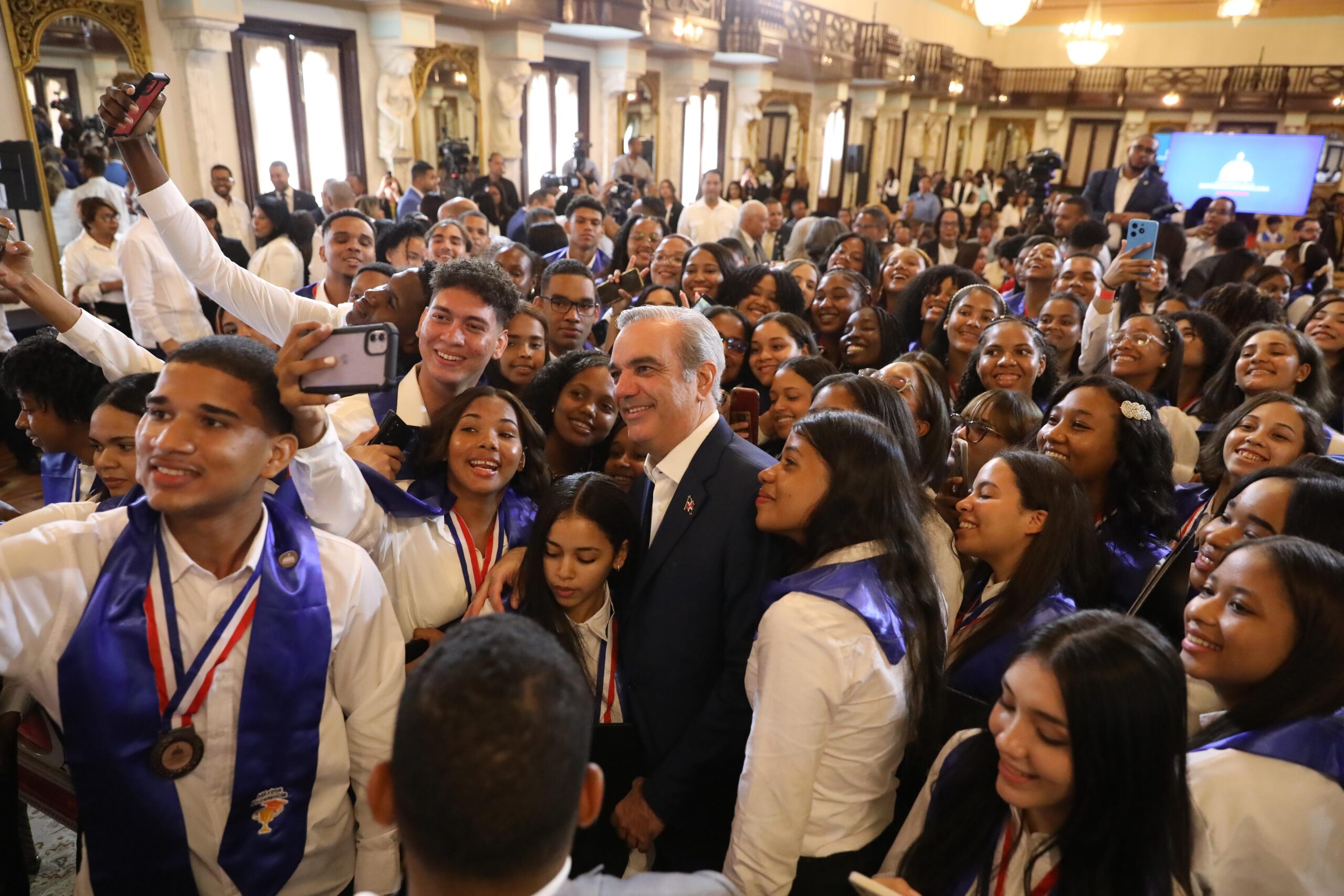 El presidente Luis Abinader junto al ministro de Educación, Ángel Hernández entregó este miércoles el «Galardón Diploma de Máxima Excelencia 2023-2024” a 150 estudiantes de las 18 direcciones regionales de educación del país, que obtuvieron un promedio académico superior a 90 puntos durante su trayectoria de seis años en la secundaria.