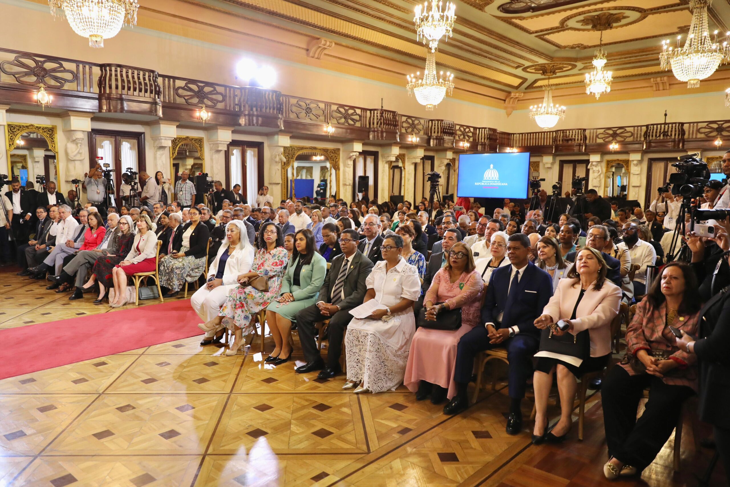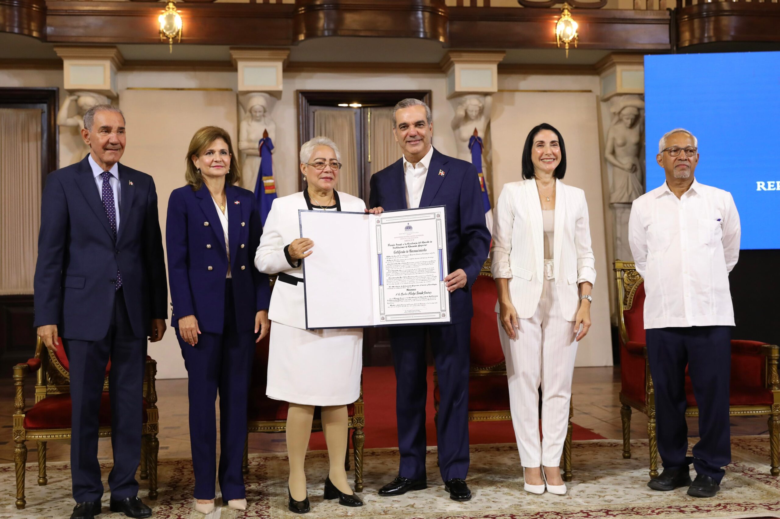 El mandatario junto a la vicepresidenta Raquel Peña; la primera dama Raquel Arbaje y los ministros de Educación, Ángel Hernández y de Educación Superior, Ciencia y Tecnología, Franklin García Fermín, también reconoció a 10 docentes en el ámbito de la Educación Superior, en el Salón Las Cariátides del Palacio Nacional.