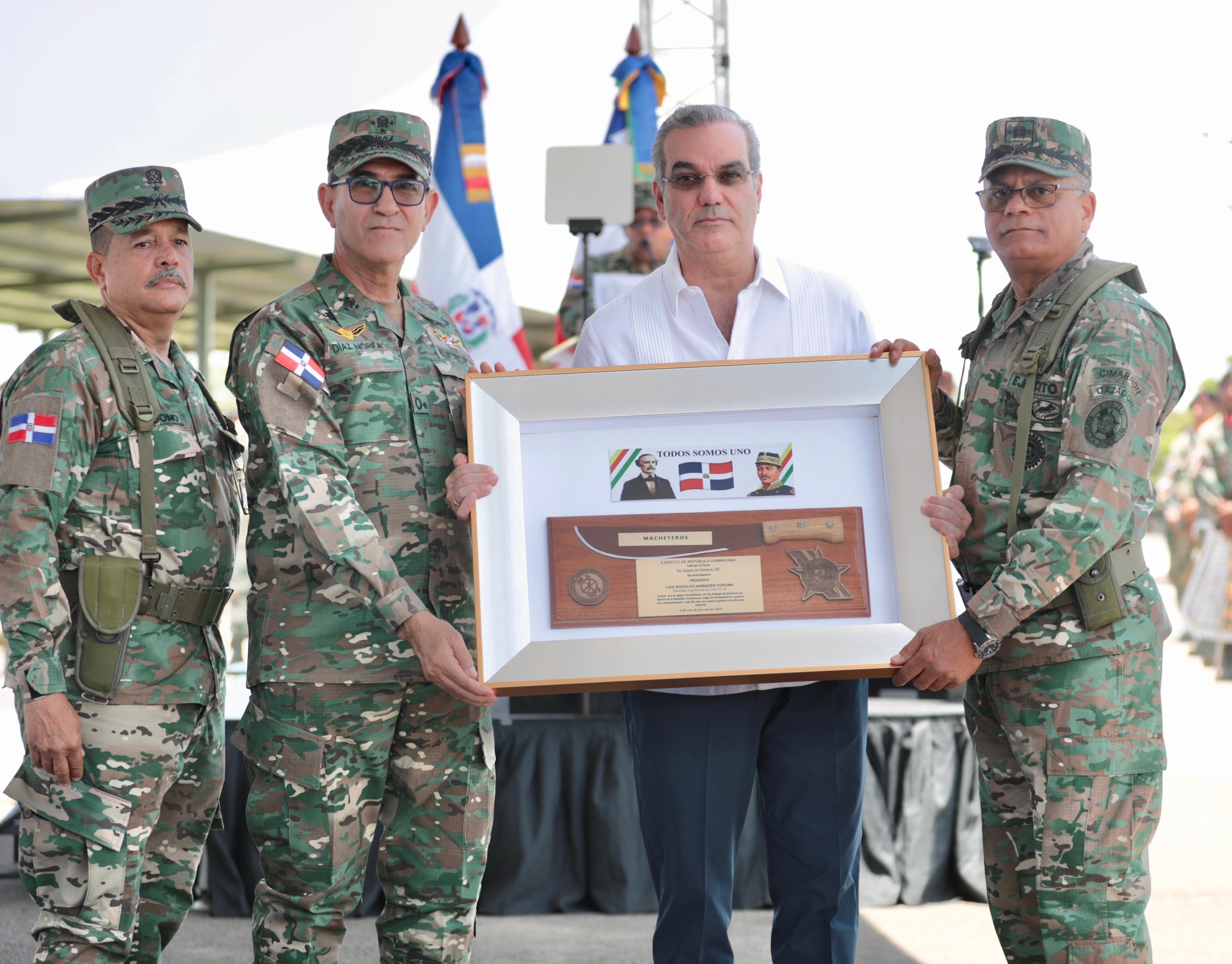 En el acto le fue entregado al jefe de Estado un reconocimiento que expresa lo siguiente: «Gracias por su apoyo incondicional a la 4ta. Brigada de Infantería del Ejército Nacional de la República Dominicana, hogar de Los Macheteros, quienes nos comprometemos cada día más con usted, su gestión y la soberanía nacional».