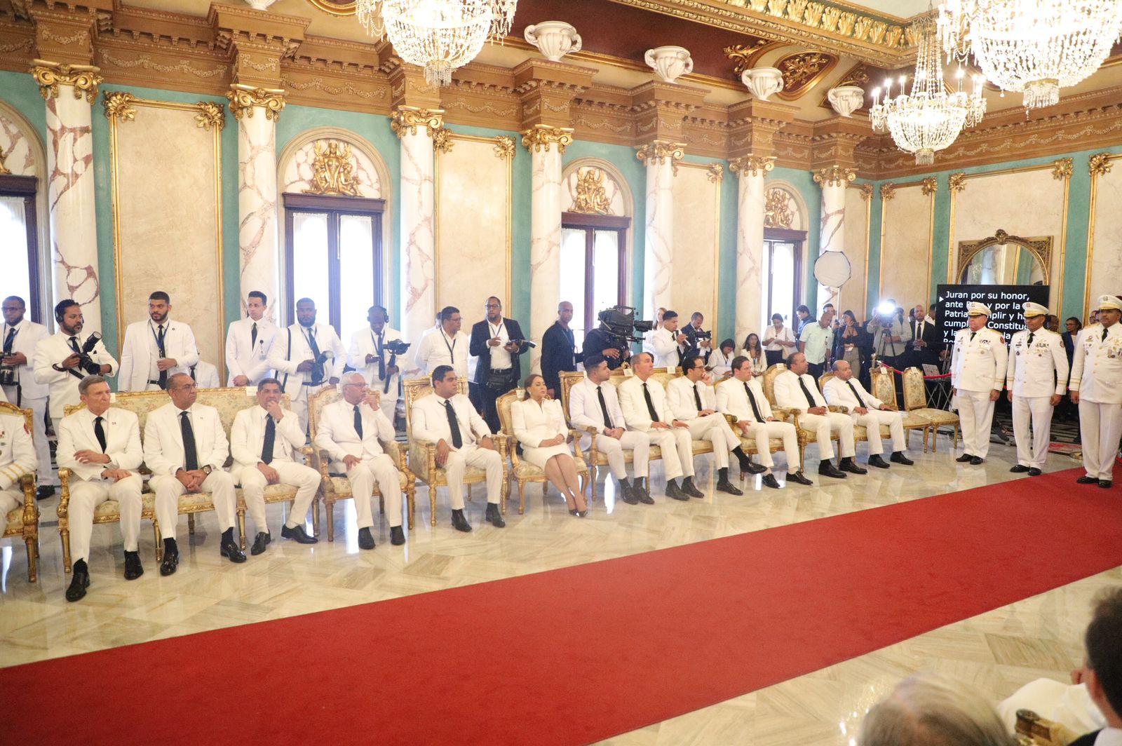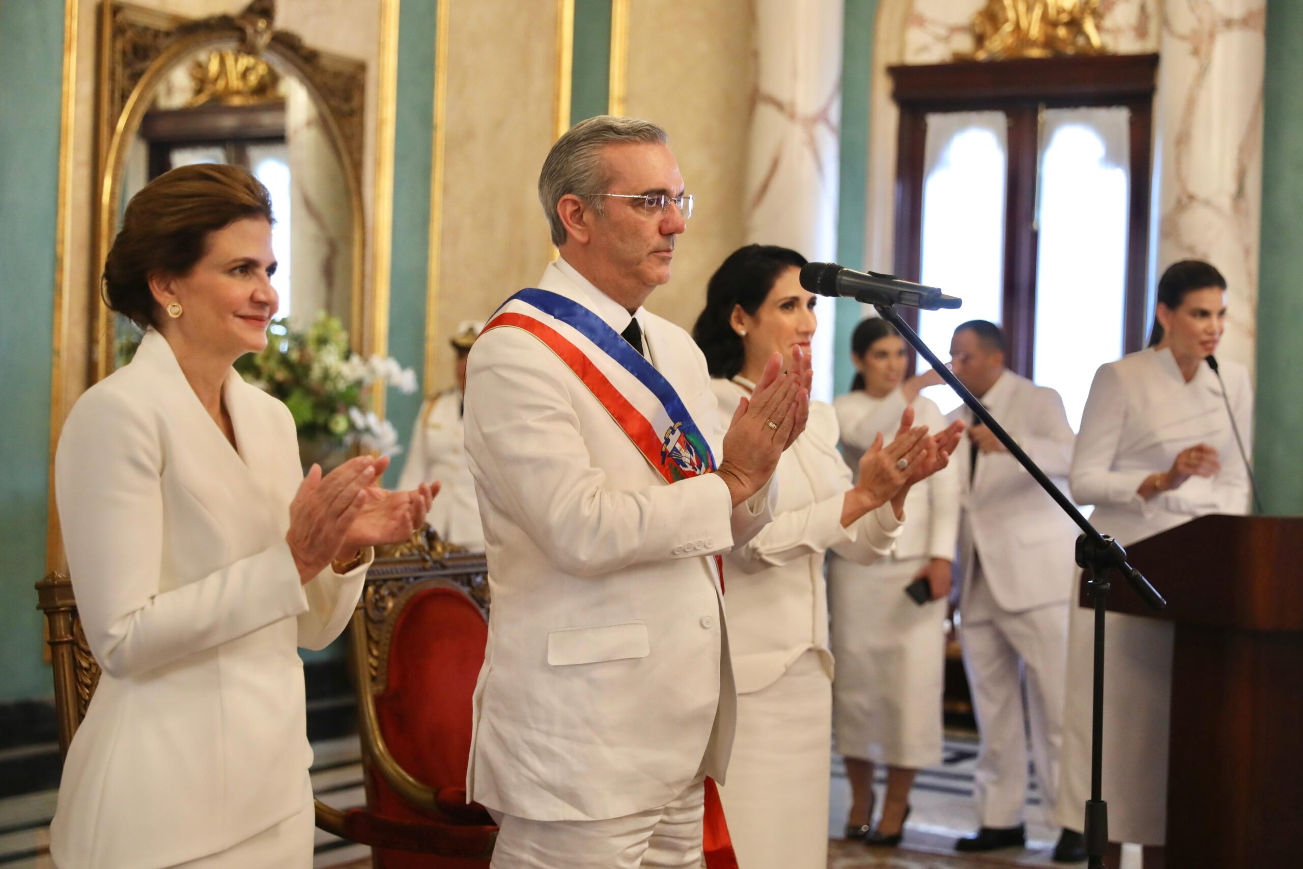 El Jefe de Estado, acompañado de la primera dama Raquel Arbaje y de la vicepresidenta Raquel Peña, tomó el juramento de los funcionarios, en un acto realizado en el Salón de Embajadores del Palacio Nacional, luego de ser investido con la banda presidencial en el Teatro Nacional Eduardo Brito que fungió como Asamblea Nacional.