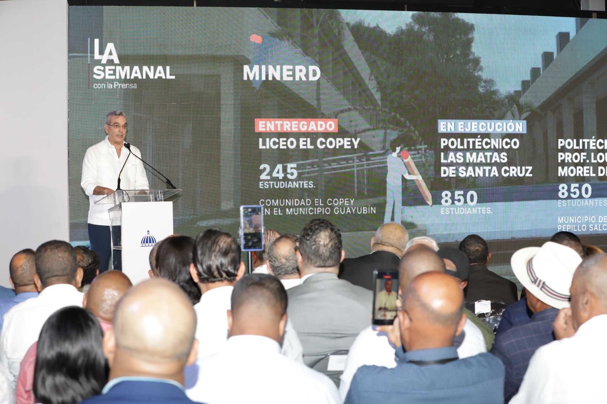 Mientras, están en ejecución los politécnicos Las Matas de Santa Cruz y Prof. Lourdes Morel de Abreu, en Pepillo Salcedo, para 850 estudiantes cada uno, y el Liceo Corina Belliard para 465 estudiantes en Hatillo Palma.