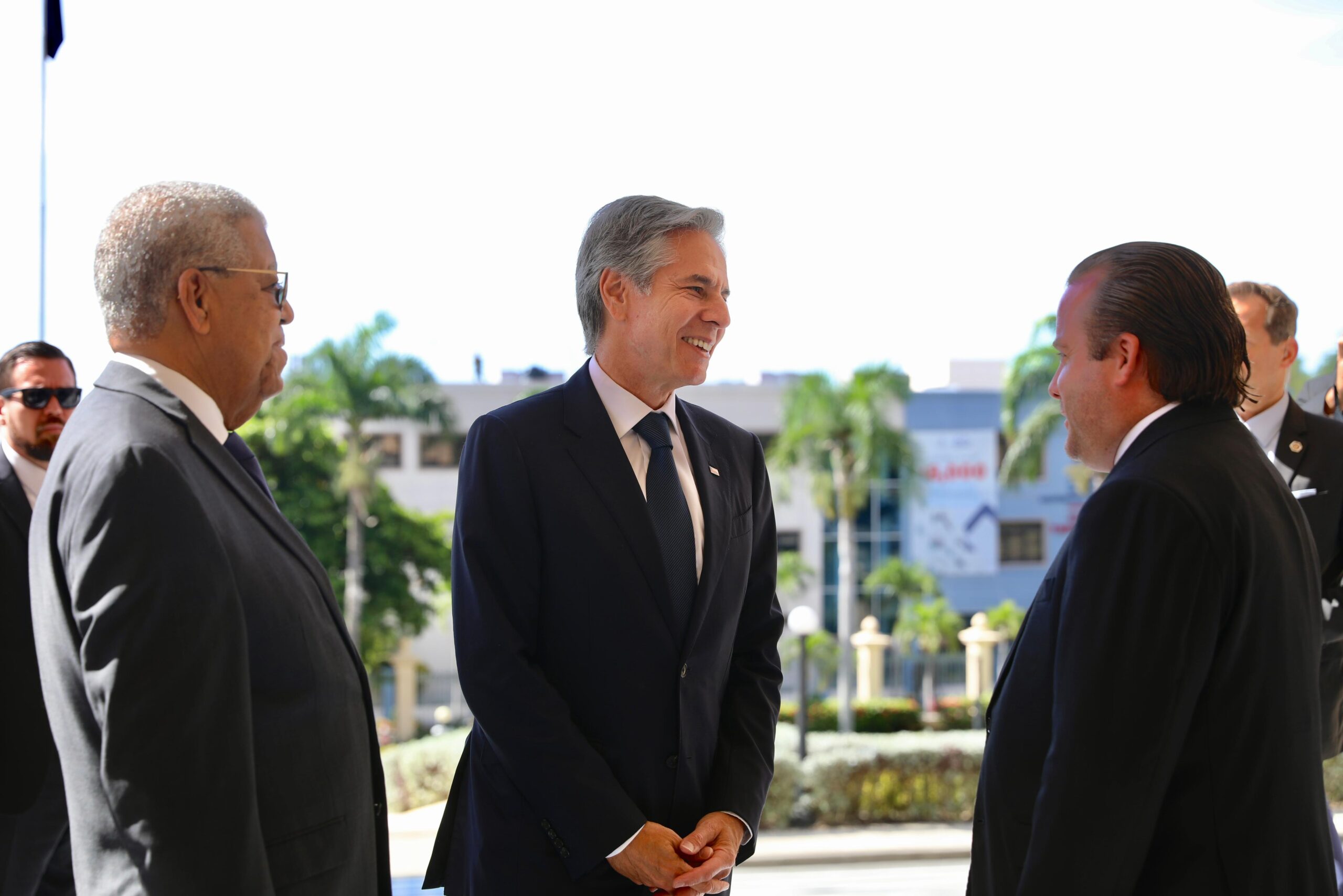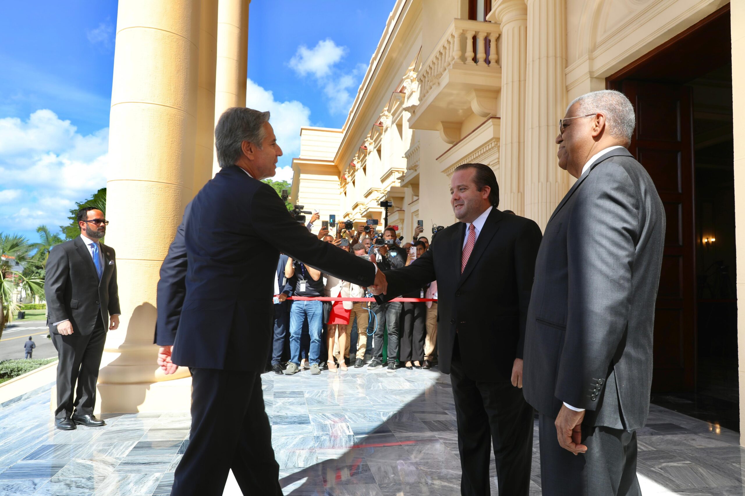 El secretario Blinken fue recibido en la Escalinata Frontal de la casa de Gobierno por el ministro de la Presidencia, José Ignacio Paliza; el viceministro de Política Exterior Multilateral, Rubén Silié y el director de Ceremonial de Estado y Protocolo, embajador Francisco José Cantizano Nadal, quienes lo condujeron hasta el Salón Blanco, donde se reunirá en privado con el presidente Abinader.