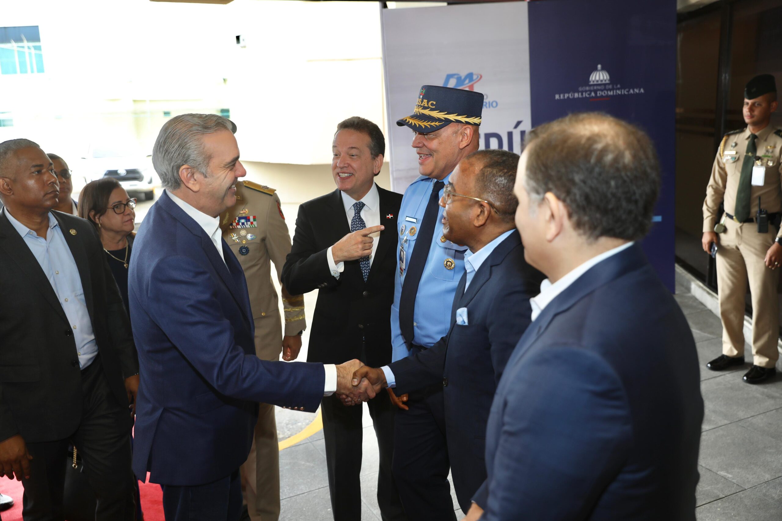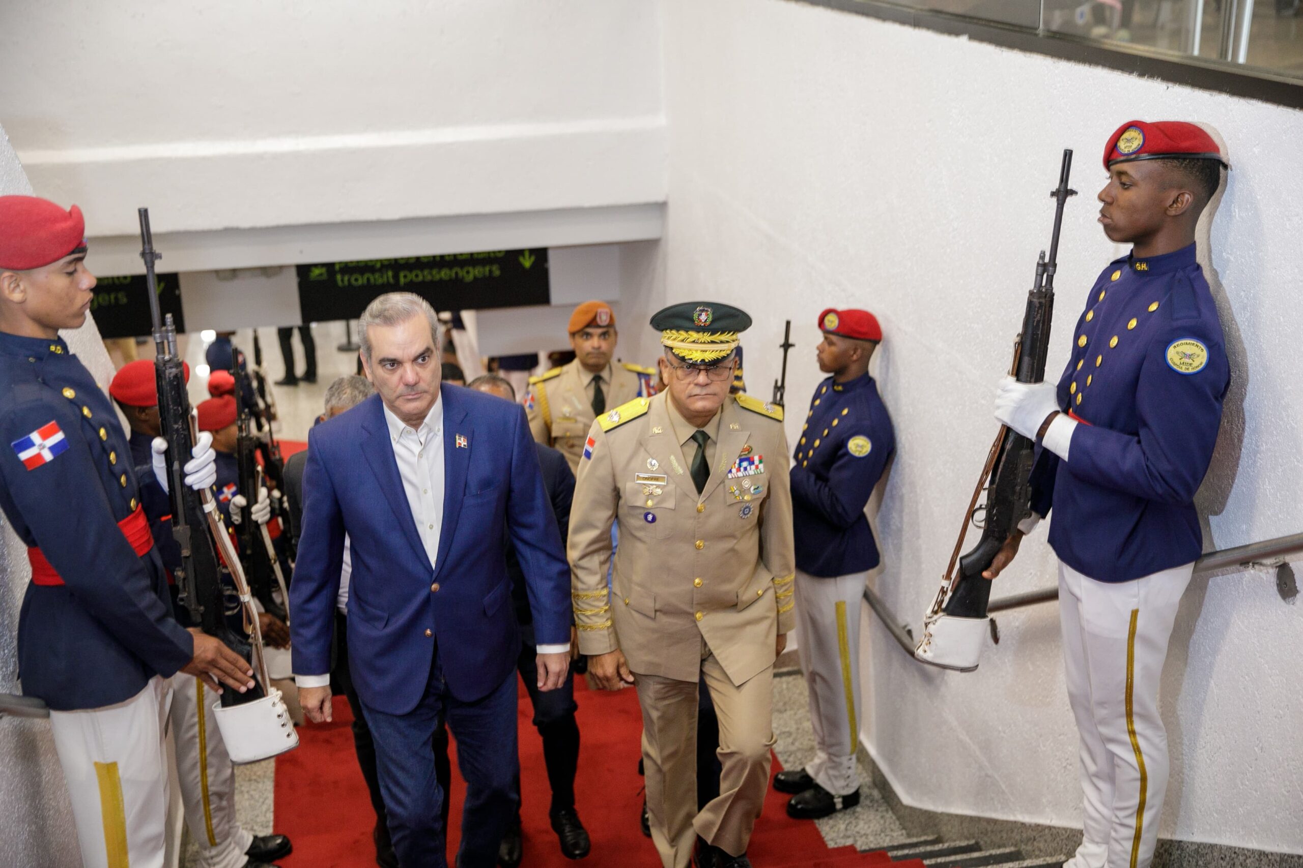 Despidieron al presidente Abinader, el ministro de Defensa, teniente general Carlos Antonio Fernández Onofre; el comandante del Primer Regimiento General de Brigada del Ejército, Guillermo Caro Cruz; el director general del Cuerpo Especializado en Seguridad Aeroportuaria de la Aviación Civil (CESAC), general de brigada piloto Marcelino Souffront Tamayo y el director ejecutivo del Departamento Aeroportuario, Víctor Pichardo.