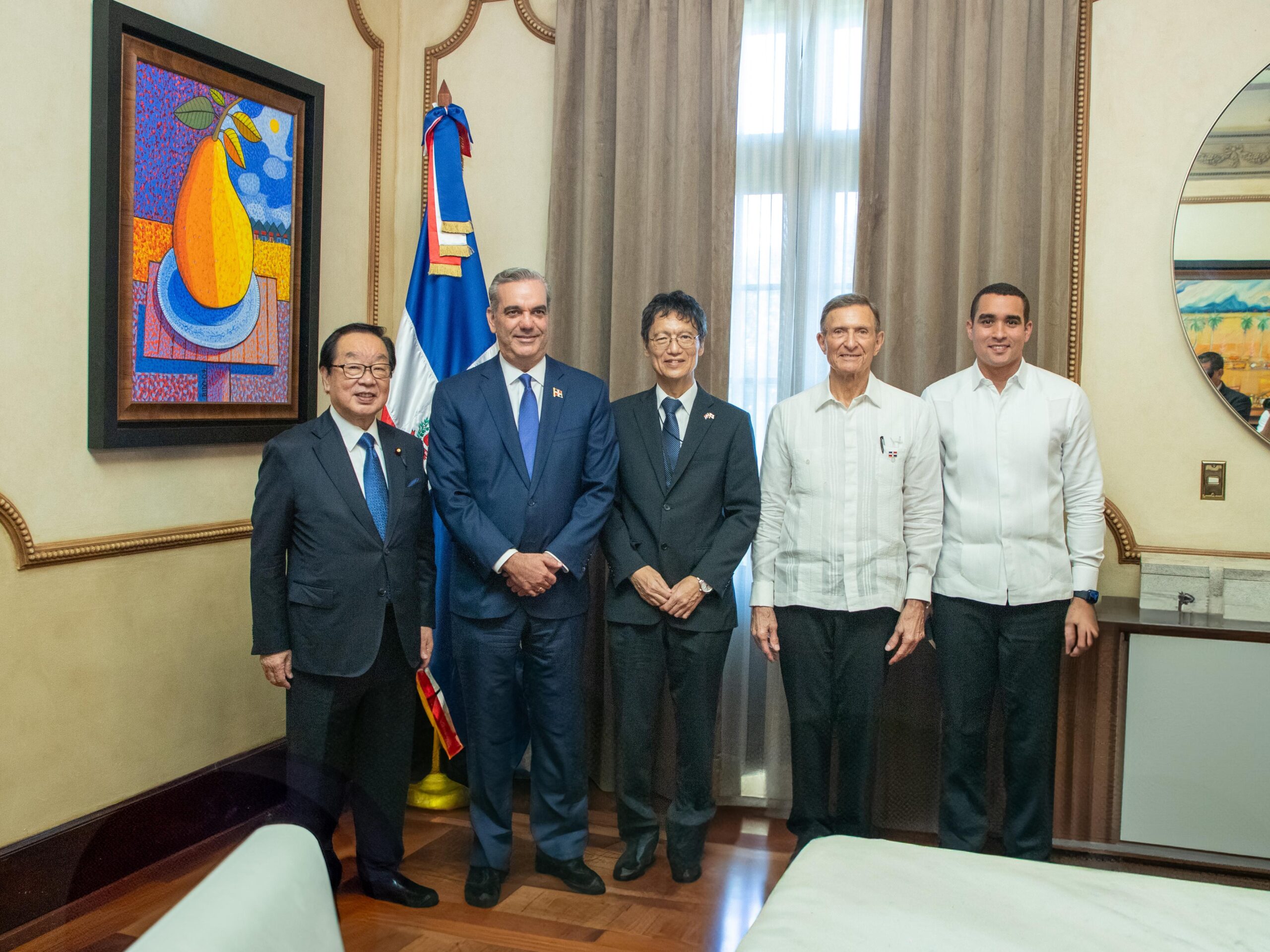 La comisión de Japón la integraron el Jefe de delegación Diputado Parlamentario, ex ministro de reestructuración, Watanabe Hiromichi; el embajador Extraordinario y plenipotenciario de Japón acreditado en República Dominicana, Tagari Masahiro; el director de la división de México, centro américa y el caribe, oficial del Ministerio de Asuntos Exteriores, Sato Shinichi; la directora Adjunta, oficial del Ministerio de Asuntos Exteriores, Yoshizawa Mina; la segunda Secretaria de la Embajada de Japón en el país, Fujiwaki Miyu y el intérprete del Jefe de Misión, tercer secretario de la Embajada de Japón en el El Salvador, Katayama Ryotaro.