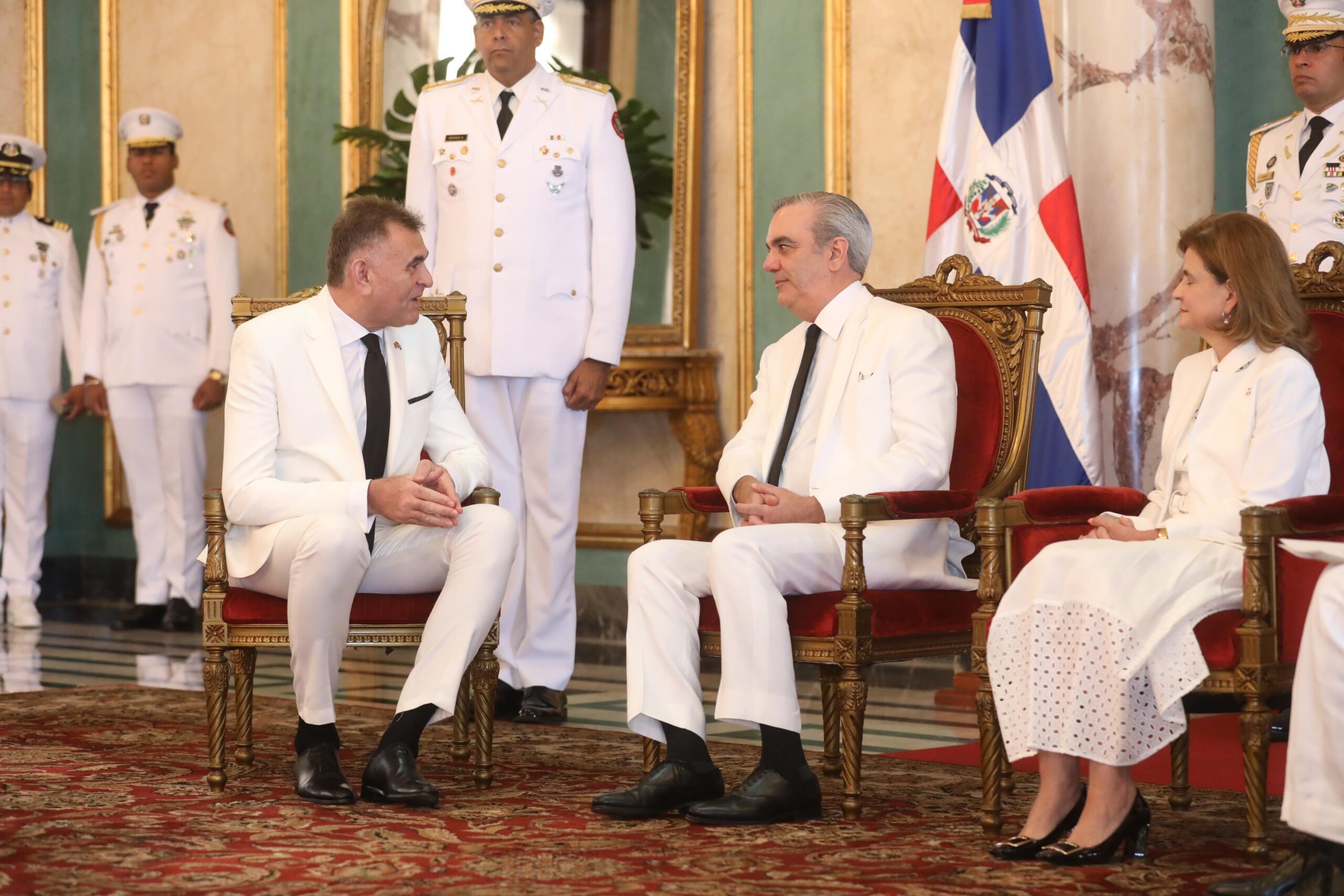 En acto previo al inicio de la entrega de las cartas credenciales, la banda de música del Primer Regimiento Dominicano de la Guardia Presidencial interpretó las notas del Himno Nacional dominicano y, al finalizar, fueron entonados los himnos nacionales de cada país representado por los embajadores acreditados ante el Gobierno dominicano.