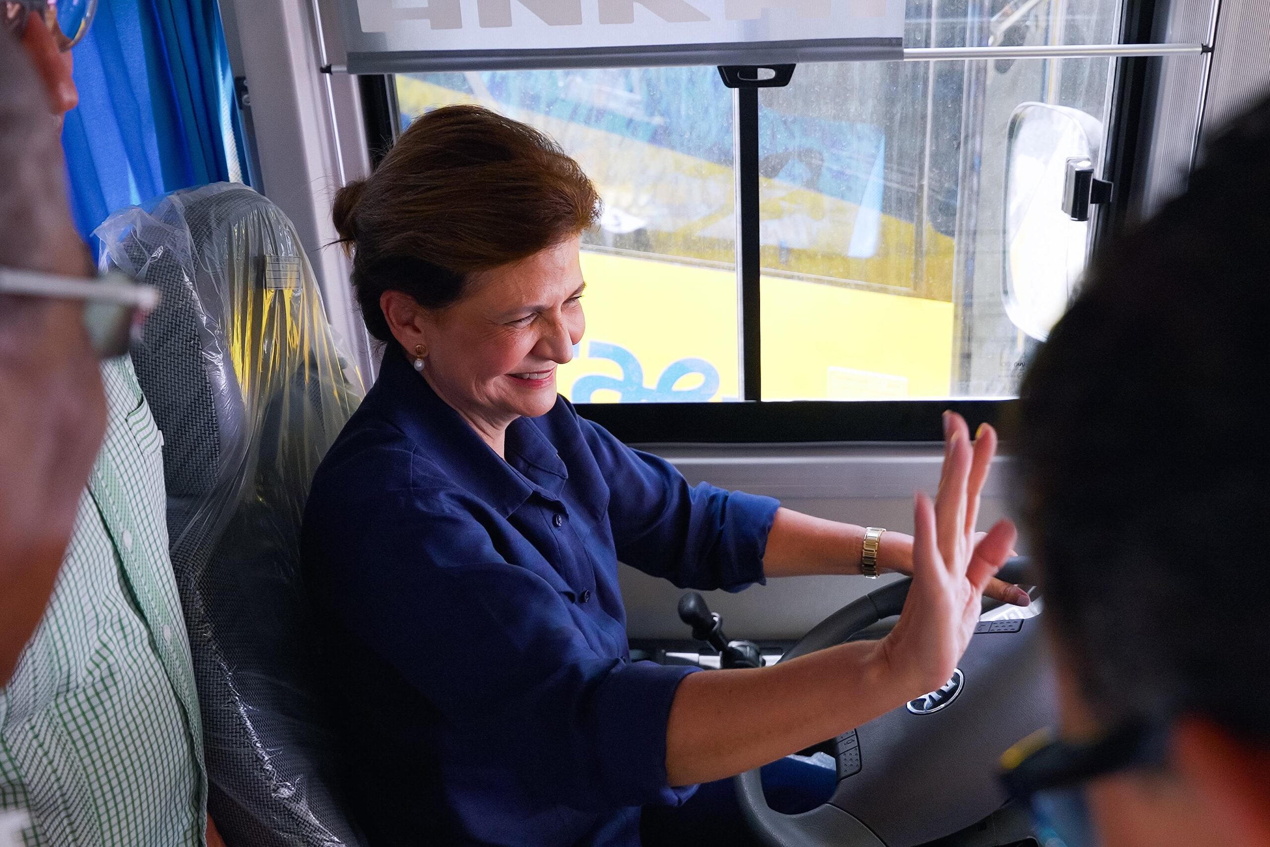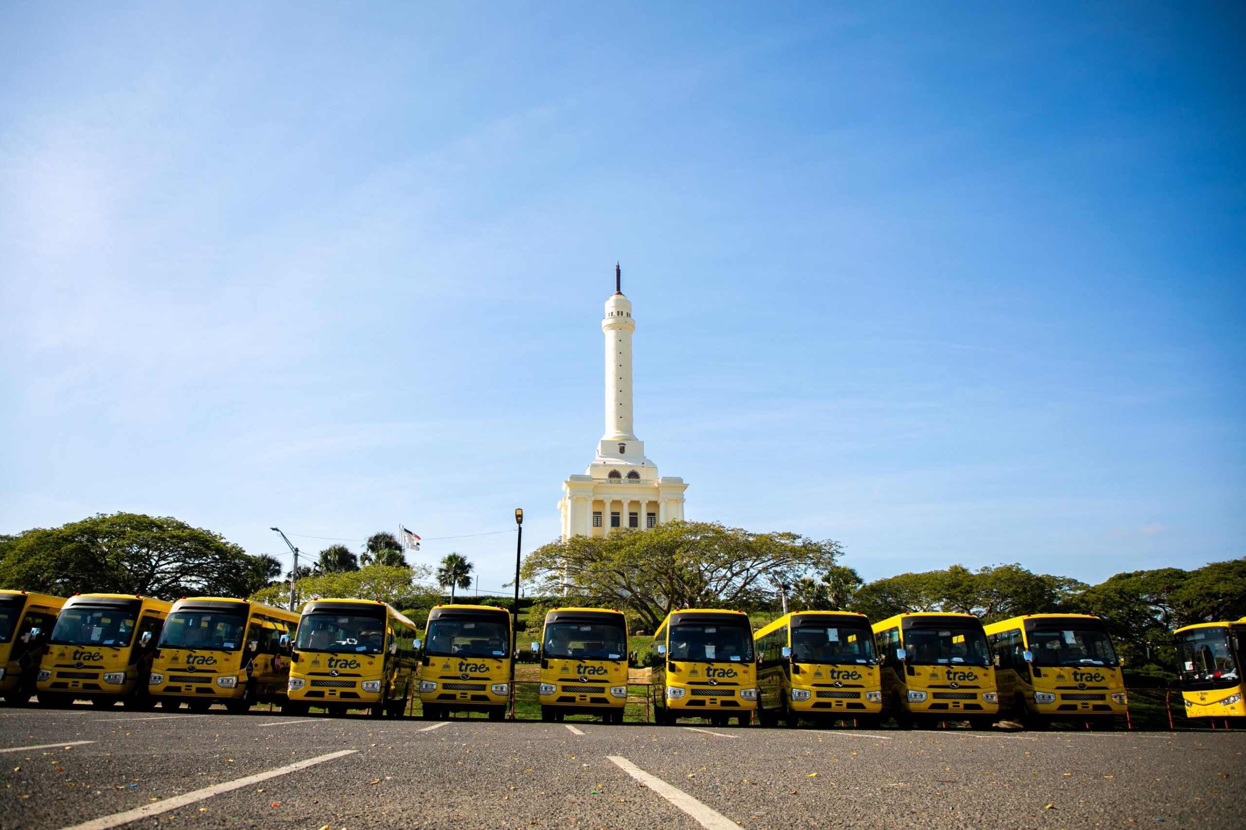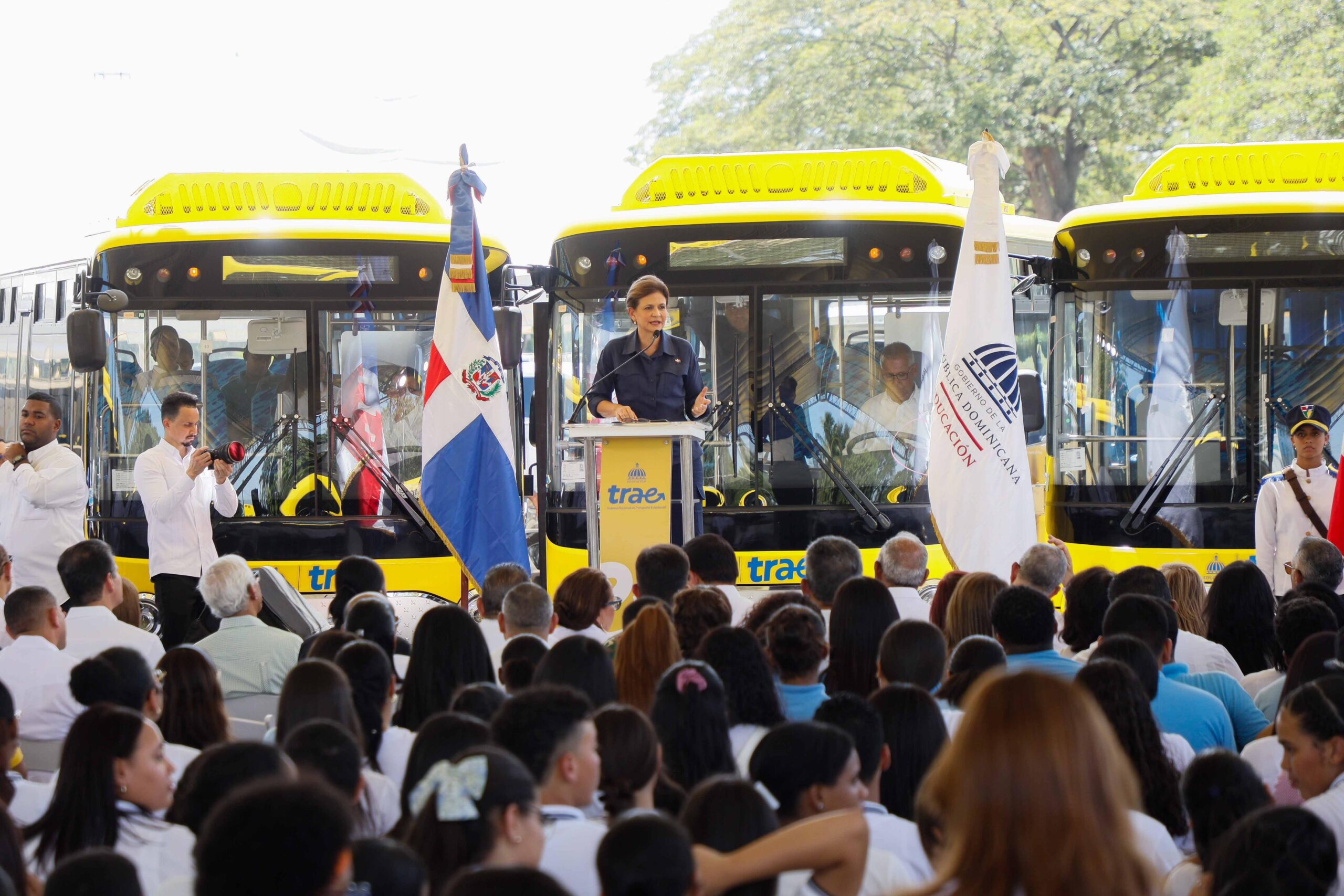 Desde uno de los 150 autobuses escolares que se entregaron formalmente este domingo en Santiago, la vicepresidenta de la República, Raquel Peña, dejó en funcionamiento el Sistema Nacional de Transporte Estudiantil (TRAE) para Santiago.