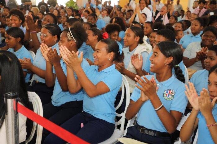 Con notable alegría y efusivos aplausos, más de un centenar de estudiantes, padres y madres, maestros y autoridades del centro educativo, recibieron en las nuevas instalaciones al presidente Abinader y al ministro de Educación, Luis Miguel de Camps.
